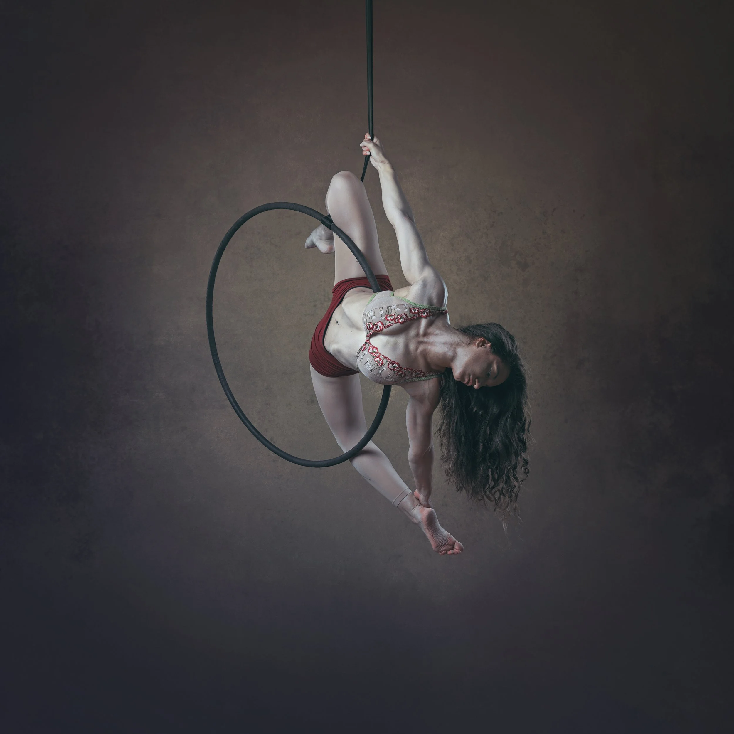 Il Cerchio è il mio attrezzo, una fusione di eleganza e forza. Esploro movimenti fluidi e pose mozzafiato sospesa nell’aria.